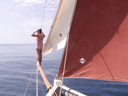 So we set off in the afternoon and had 3 hrs before sunset. We started off with a SE F3-4 which allowed us to lay a course directly for Ihla do Sal, but this only lasted a few hours. By the following morning the wind was in the south F1-2 and our speed was down to around 1K. It continued to vary between SSE and SSW for the rest of the day but picked up a little in strength and we were under full sail including tops'l and jib tops'l, but unfortunately the direction did not allow the use of the assymetric. We tacked to take advantage of the wind shifts and in our first 24 hrs did quite well to cover just over 100M. The second day we continued to tack into adverse winds and made only 71M. By the 3rd morning we were totally becalmed and rolling uncomfortably in the swell. The slamming of the boom ripped the rope grommet out of the clew on the mainsail so we dropped all sail and motored. I had to ration the use of the motor to eke out the fuel supplies.